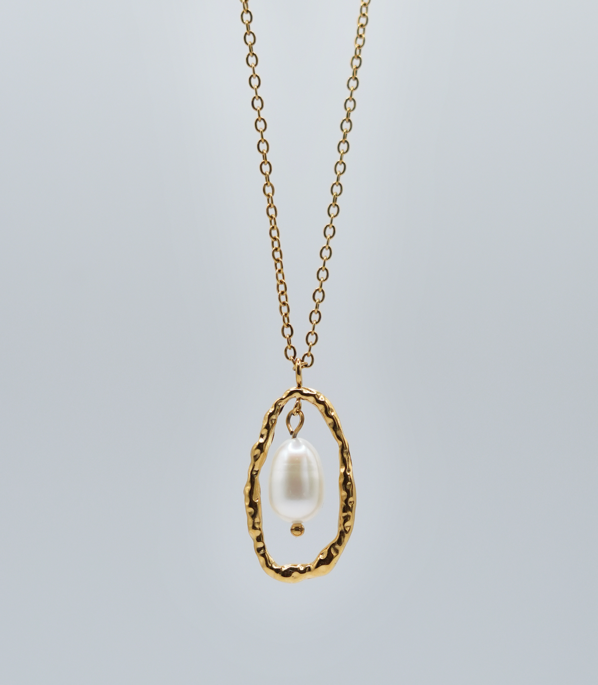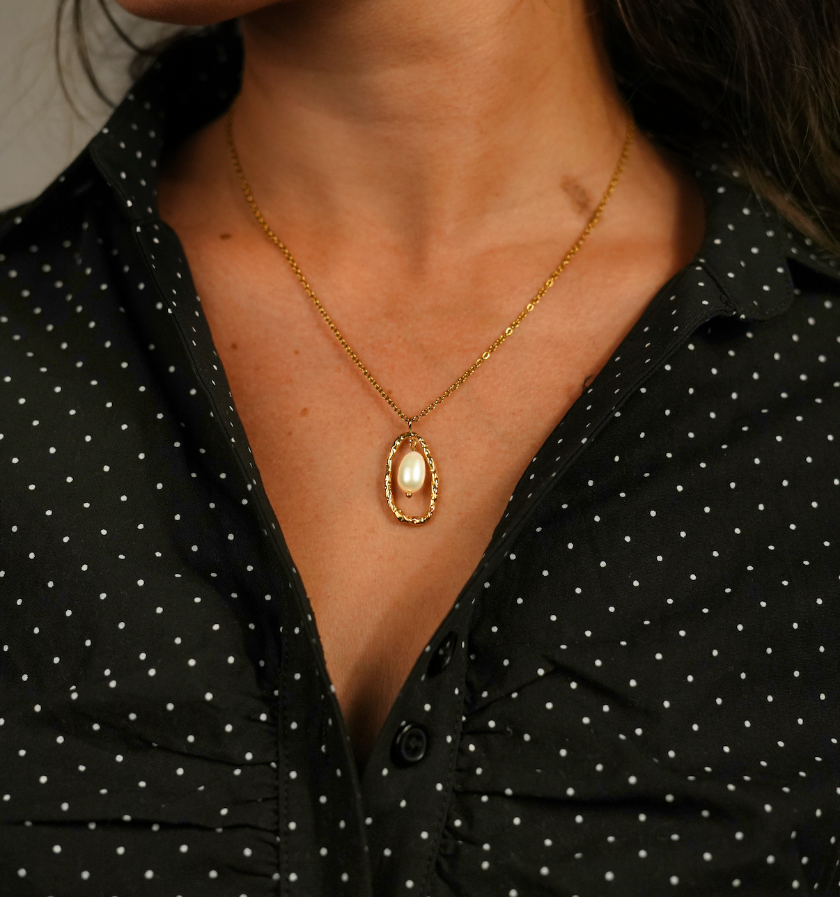 Sa perle nacrée, entourée d’un cadre doré texturé, symbolise la pureté et la force tranquille de celle qui le porte.