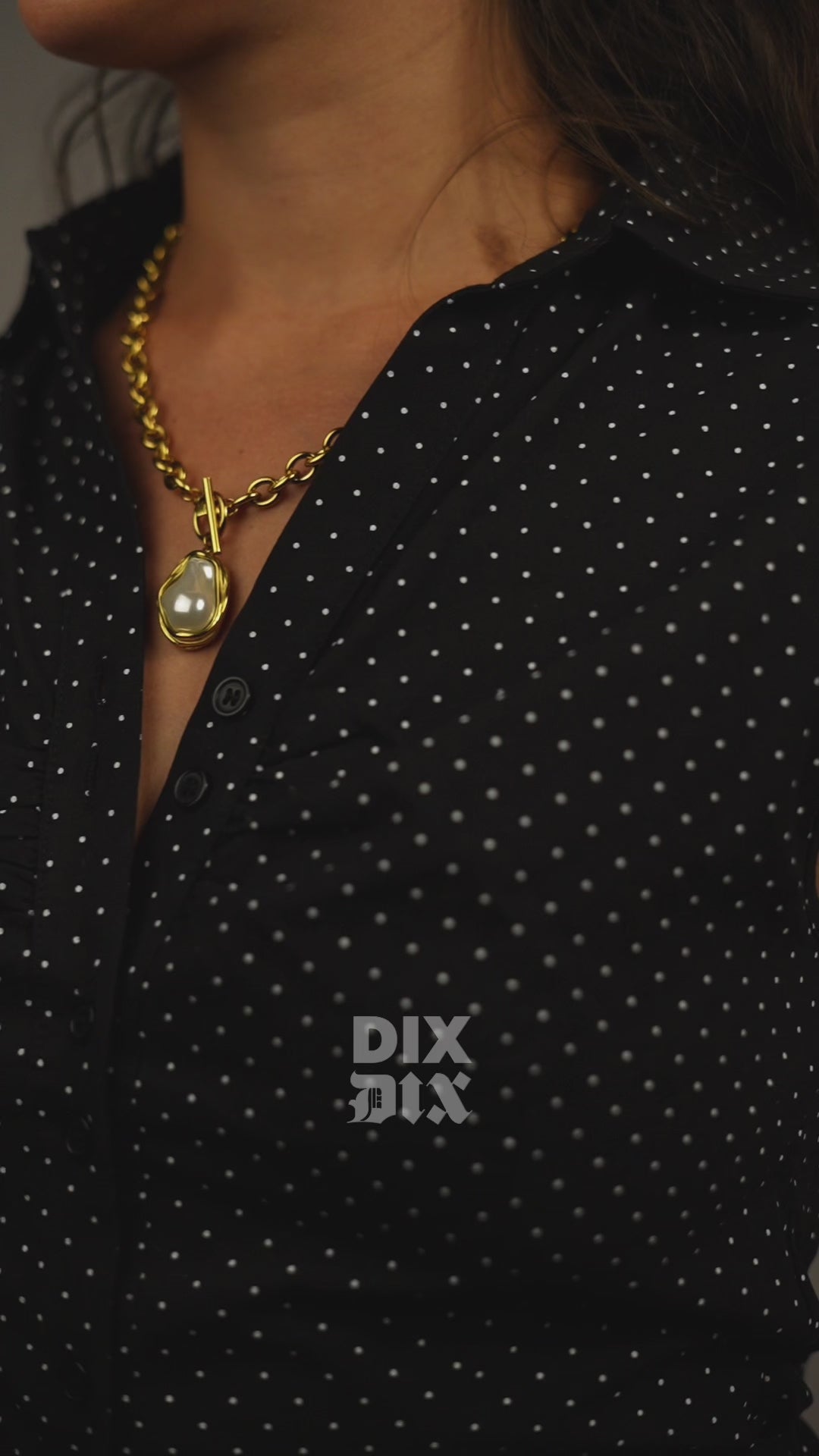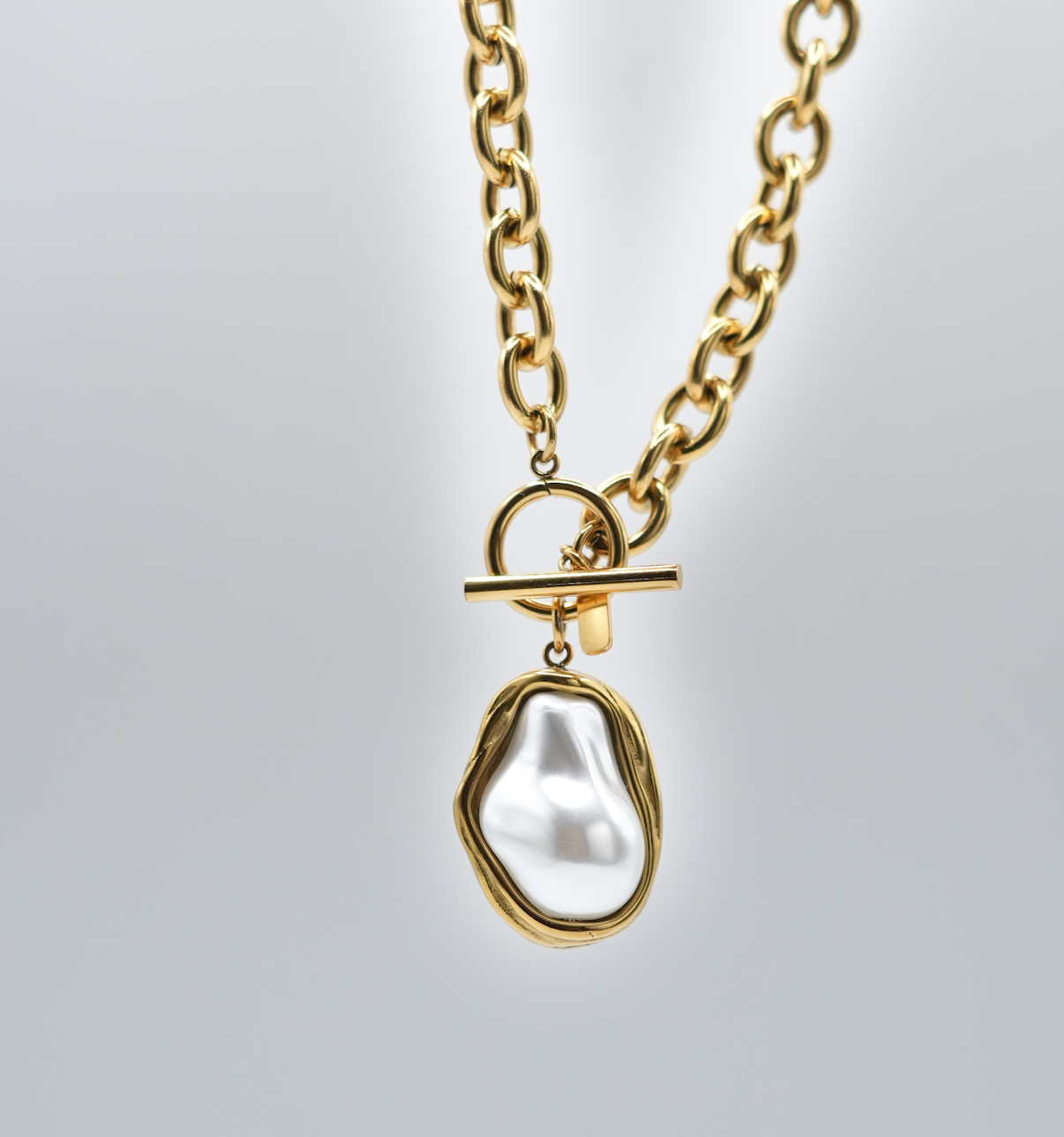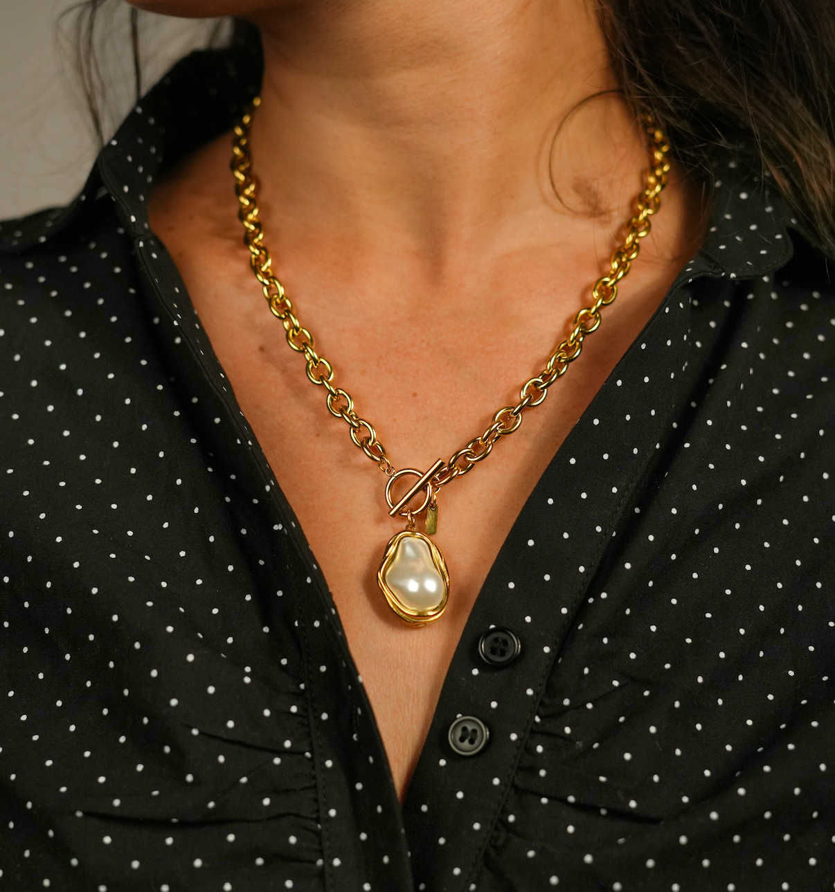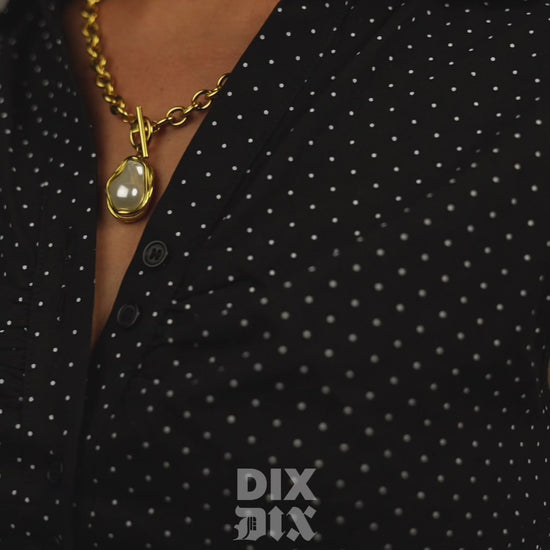 Sa perle irrégulière rappelle que la vraie beauté réside dans l’imperfection, tandis que sa chaîne dorée symbolise la puissance féminine.