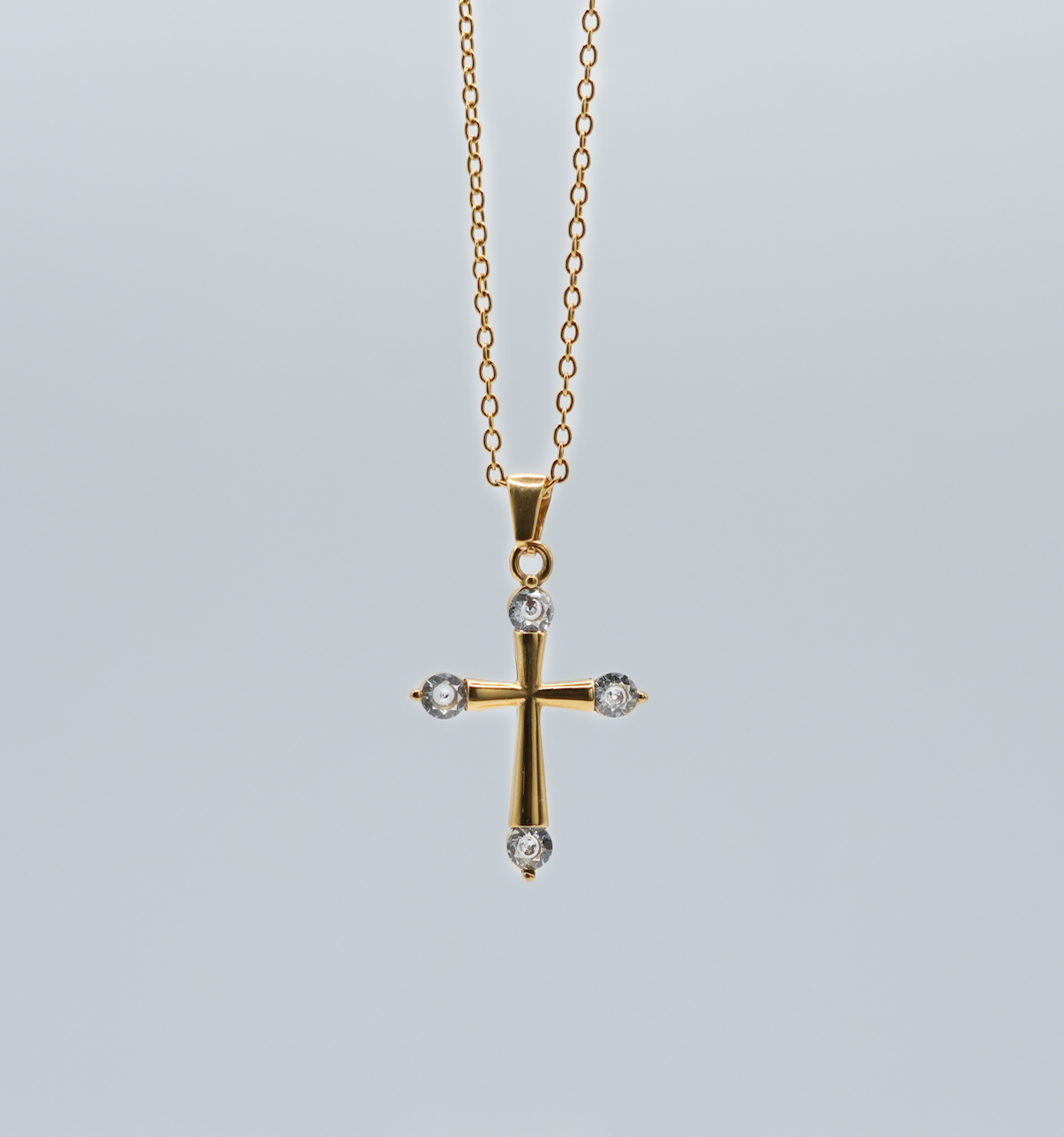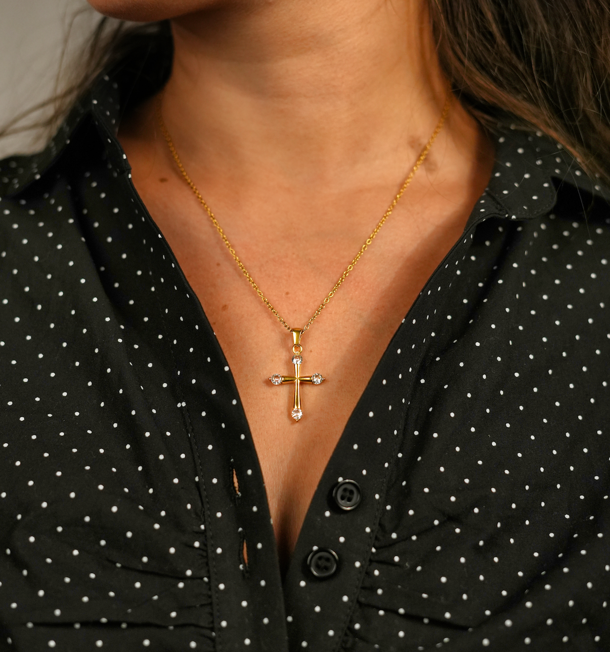 Sa croix délicatement ornée de pierres claires reflète la paix intérieure et la force tranquille de celle qui la porte.